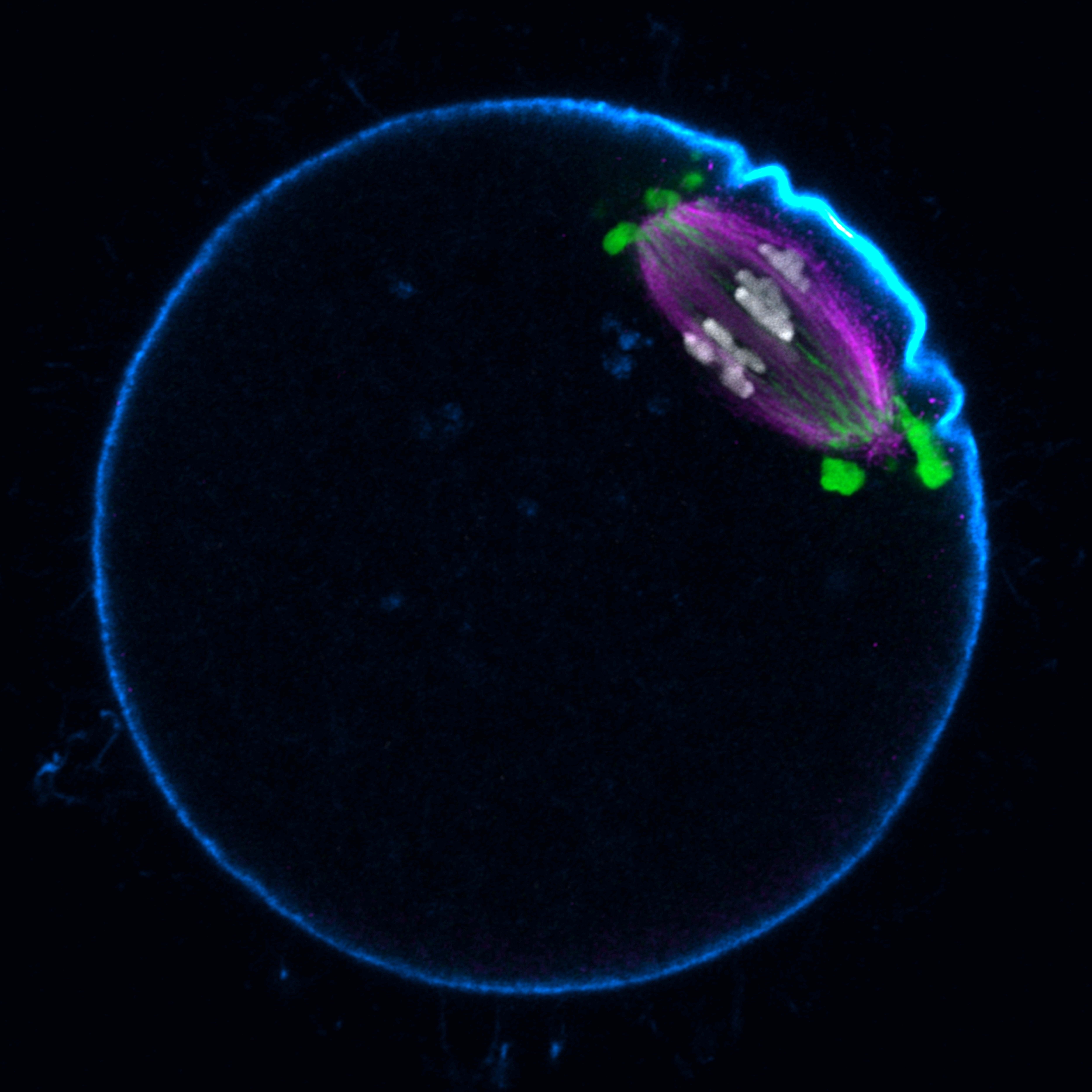 This is a fluorescence microscopy image of a cell undergoing meiosis. During meiosis, the egg (in cyan) halves its set of chromosomes (in grey) before fertilisation. This reduction is critical for sexual reproduction, allowing the fertilised egg to have a complete set of chromosomes, with half contributed by each parent.