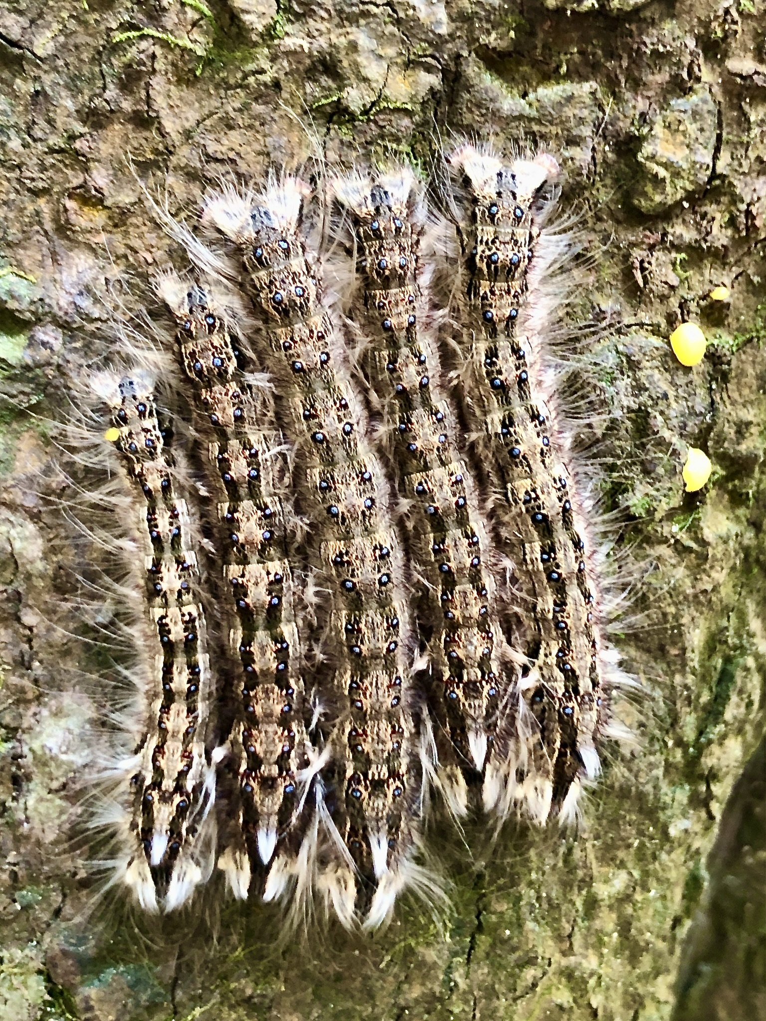 This image is a close-up of a group of Lappet moth caterpillars (Metanastria gemella) on a tree in Aberdeen Country Park in Hong Kong. Despite their relatively small size (up to 7 cm), these caterpillars can be harmful to humans through the use of an irritant chemical that is released when their bristles or hairs are triggered. This can cause allergic reactions such as a rash, blistering, or even nausea.
